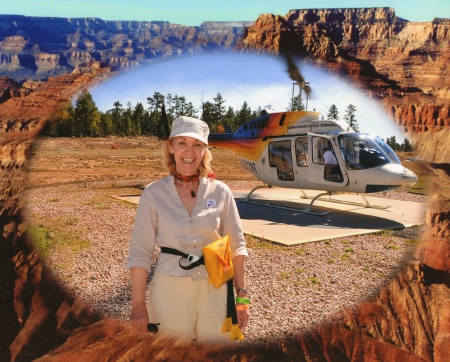 The helicopter experience:    The tour bus from Las Vegas carried 75 passengers only five of whom had elected to fly the canyon — myself and four large Polish men visiting from Illinois.  The bus driver via PA announced ‘flyers’ would not be served lunch until after the flight as it could ‘come out both ends’  but we need not be nervous as there were bags aboard for the use of.  I, and the four  Polish men, were taken to a small side room and shown three safety videos elucidating  the range of seat belts for various helicopters and the somewhat confusing system for fastening and unfastening them, the flotation device we would wear while aboard, and  the location of the vomit bags.  I signed a waiver absolving the company of all liability is the case of my death or injury and stood on a scale to be weighed.  I, as  the lightest of the five, would take the co-pilot seat.  A staff member fitted the flotation equipment around my waist then I was instructed by a grim looking photographer to stand and be photographed.  I guessed this photo would be shown to my children in lieu of identifying my eviscerated and scorched remains after the helicopter crash into the canyon’s depths.   The thought of my next of kin looking at my photo under tragic helicopter crash circumstances made me laugh happily. I discovered later the photo was  meant just as a souvenir of the Grand Canyon.  See how happy I look.